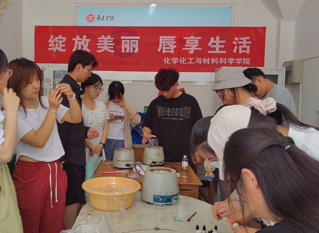 首先由化学协会成员为参加此次活动的同学进行相关的专业讲解,详细地为同学们介绍了制作口红的材料设备和制作口红的方法并且演示了一遍具体流程。根据讲解,大家根据个人喜好,将色粉、精油等材料按顺序倒入烧杯中,搅拌至全部融化,接着将融化的液体倒入模具中,冷却凝固后脱模,成功做出一支自己的专属口红。