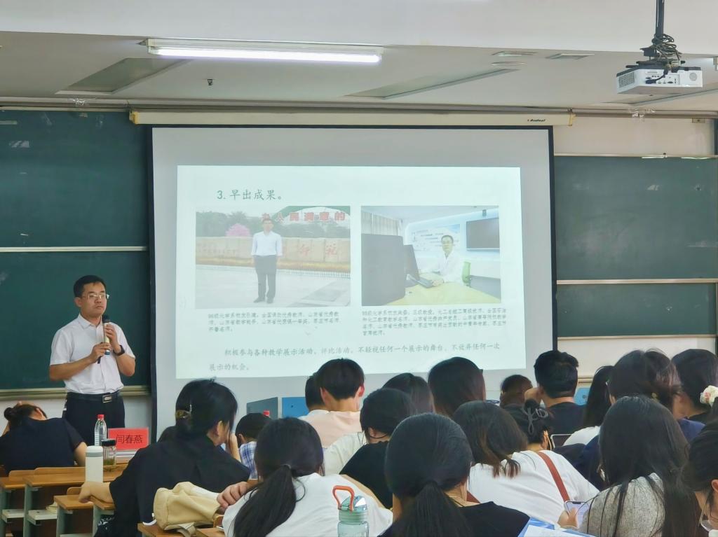 蔓蔓日茂,芝成灵华。孙校长在阔别多年后重返校园,看见亲爱的老师和可爱的学弟学妹们,他心情激动,思绪万千,仿佛又回到学生时代、青春岁月。他感谢老师们的信任,更感恩母校的教育培养。他结合自身学习与工作的经历,分别从“做好心理转变的准备、做好角色转变的准备、做好职业规划的准备”三个方面分享了自己在奋斗道路上的收获与感悟,引领同学们去探究、思考新时代背景下如何实现师范生的职业准备和新教师的专业成长。