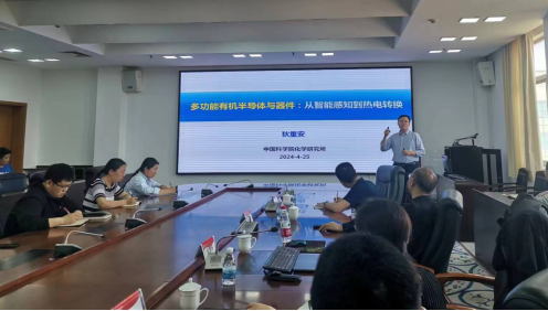 刘泳对狄重安研究员莅临“名师大讲堂”表示欢迎,并详细介绍了狄重安研究员的研究方向和成果。随后,狄重安以《多功能有机半导体与器件:从智能感知到热电转换》为题,介绍了高迁移率有机半导体的发展策略,在此基础上开展的有机场效应晶体管在多功能传感器、仿生突触器件和自适应器件的研究进展,并对分子材料在智能感知领域的应用进行展望。