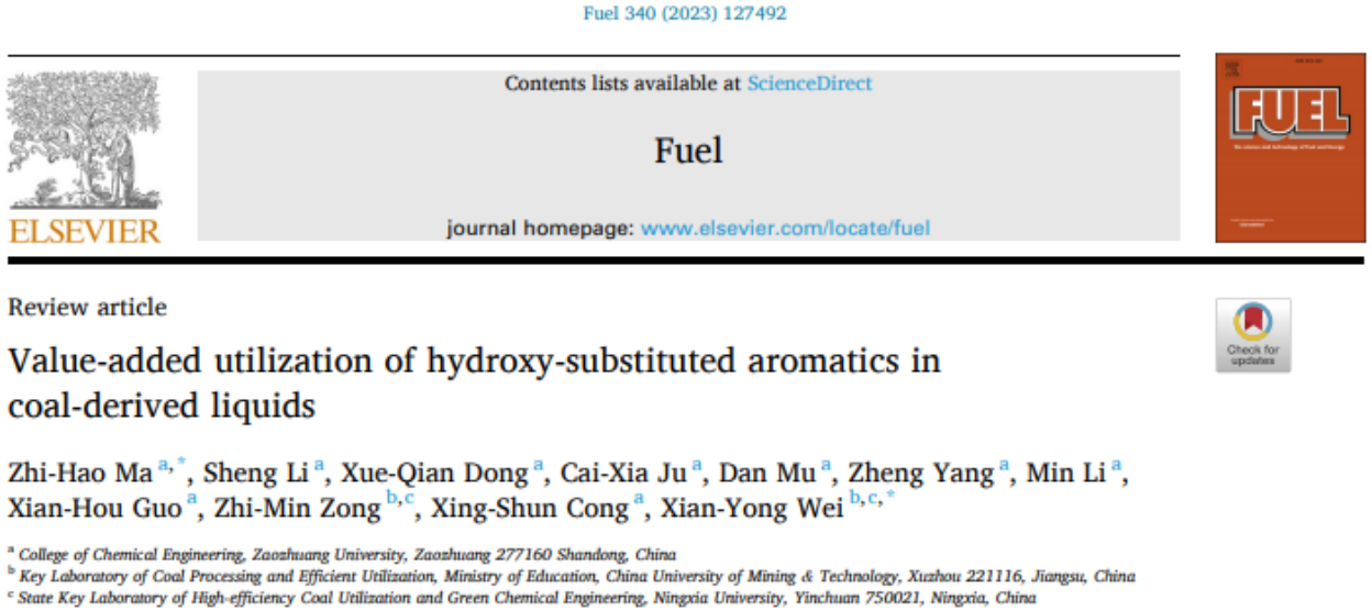 1月19日,我校“低碳能源化工团队”麻志浩博士在《Fuel》期刊发表题为“Value-added utilization of hydroxy-substituted aromatics in coal-derived liquids”的学术文章。《Fuel》(SCI一区TOP期刊,IF:8.035)是“燃料”领域的三大国际期刊之一。