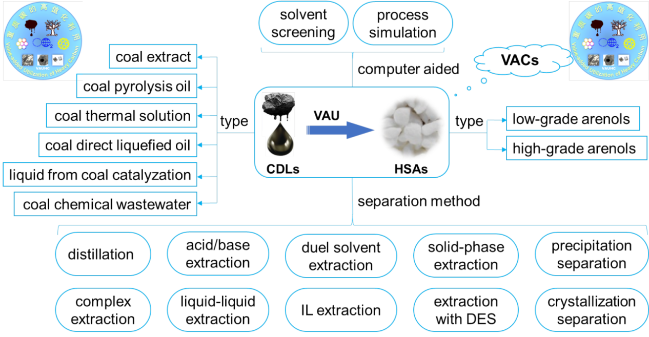 煤液体衍生物中高附加值羟基取代芳烃的高值化利用是应对当前全球能源挑战的主要途径之一。本文主要讨论了煤液体衍生物的来源、芳烃醇的形成机理和类型及其高值化利用。煤液体衍生物中羟基取代芳烃的高值化利用还有很大的改进空间,尤其是在分子鉴定、生产方法、分离方法和产业发展方面。基于发展清洁、低碳、安全、高效的煤化工产业的基本设计理念,可以从以下几个方面尝试开展煤液体衍生物中羟基取代芳烃的高值化利用研究:(1)不同类型的煤液体衍生物具有不同的性质。了解其来源、分子结构和成分组成是认识羟基取代芳烃高值化利用的前提。(2)开发环境友好的分离技术,在对环境影响最小的情况下,从煤液体衍生物中定向分离羟基取代芳烃,对煤的高效利用具有重要的意义。优化分离因素包括溶剂选择、用量、时间、温度、能耗、成本和分离机理,这些因素直接影响后续处理的难度。(3) 煤液体衍生物中羟基取代芳烃的特定分离技术的选择取决于目标化学品的物理化学性质。多个分离步骤的整合是必要的,并且必须是有效的,这决定了化学品的纯度和产量。(4)从实验室到产业化,分离过程中需要做的工作是巨大的。计算机辅助包括分子间作用力的计算、分离溶剂的筛选、分离过程的设计、模拟和优化可以节省分离过程的开发时间。实验与理论、实验与模拟、理论与模拟应该有机地结合起来,以加速煤液体衍生物中羟基取代芳烃的高值化利用。(5)产业发展是亟待解决的问题。从煤液体衍生物的制备、提取、纯化、高值化利用、溶剂回收和三废有效处理的绿色、高效、低能耗、高能量回收的总体方案也需要在前期研究的各个环节进行考虑和参与。