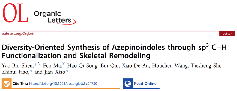 近日,我院“化学生物学创新团队”沈耀滨博士在有机合成化学领域取得最新进展。相关研究成果以《Diversity-Oriented Synthesis of Azepinoindoles through sp3 C−H Functionalization and Skeletal Remodeling》为题,发表在国际著名期刊《Organic Letters》(自然指数期刊,中国科学院一区TOP期刊)上。沈耀滨博士为论文第一作者及通讯作者,yl7703永利集团为第一完成单位。