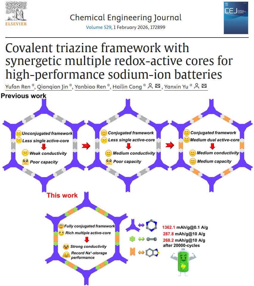研究成果二: Covalent triazine framework with synergetic multiple redox-active cores for high-performance sodium-ion batteries。该工作2025级硕士研究生任雨凡为第一作者,于延新博士、丛海林教授为共同通讯作者。