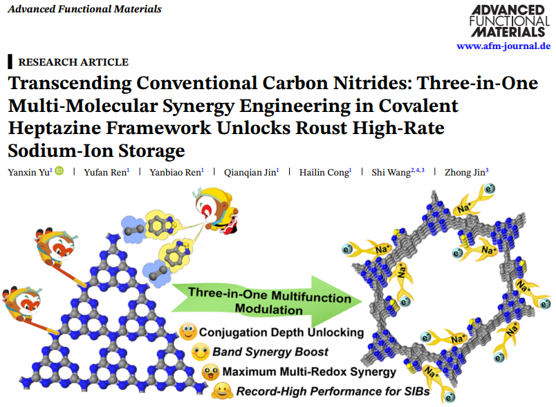 研究成果一: Transcending Conventional Carbon Nitrides: Three-in-One Multi-Molecular Synergy Engineering in Covalent Heptazine Framework Unlocks Roust High-Rate Sodium-Ion Storage。该工作于延新博士为第一作者兼通讯作者,丛海林教授为共同通讯作者。