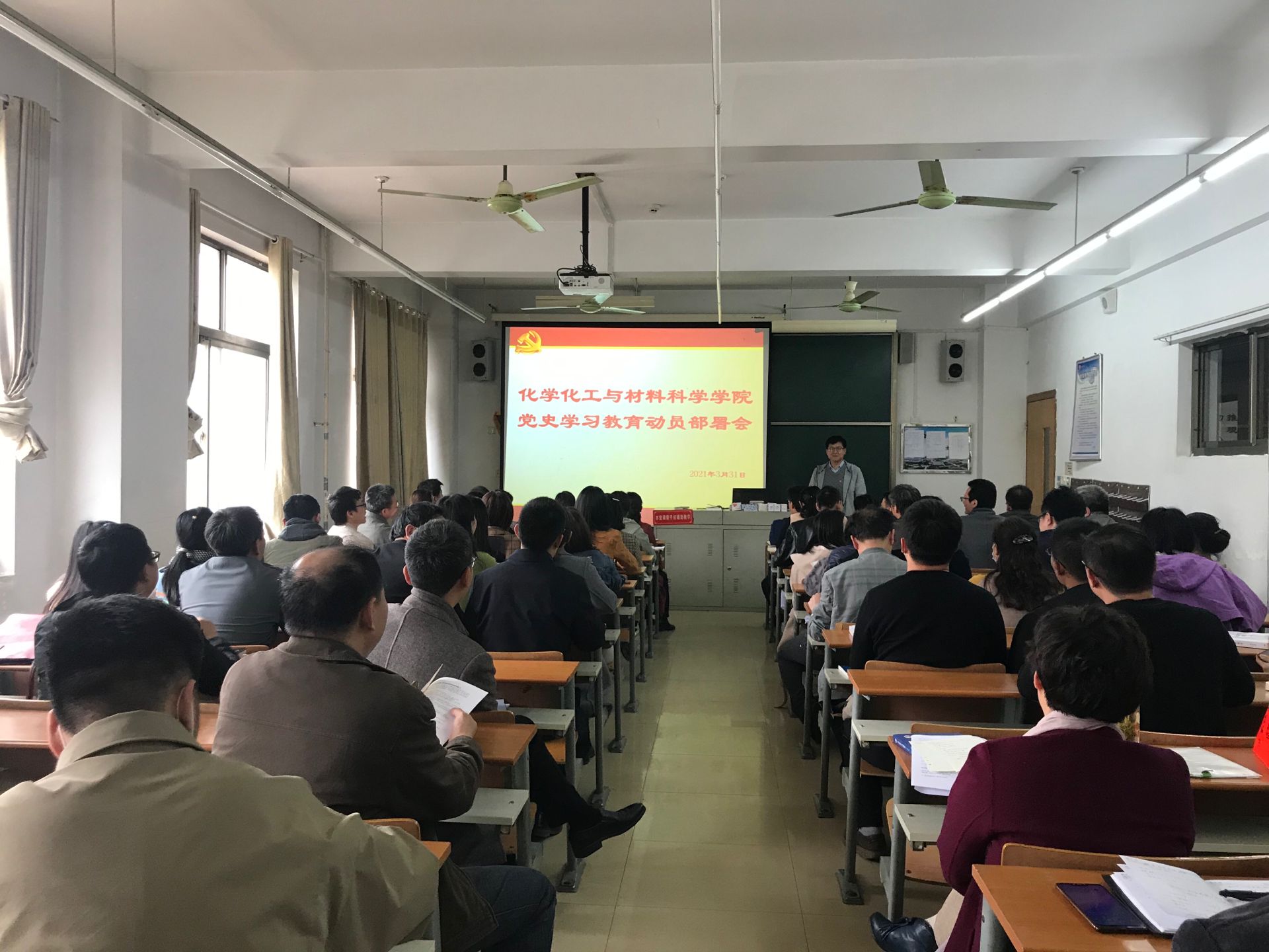 3月31日下午,化学化学与材料科学学院在综合楼1215教室召开党史学习教育动员部署大会。按照学校相关要求,紧密结合学院实际,对开展党史学习教育进行动员部署。全院教职工以及全体学生党员参加会议,会议由副处级组织员李鑫主持。