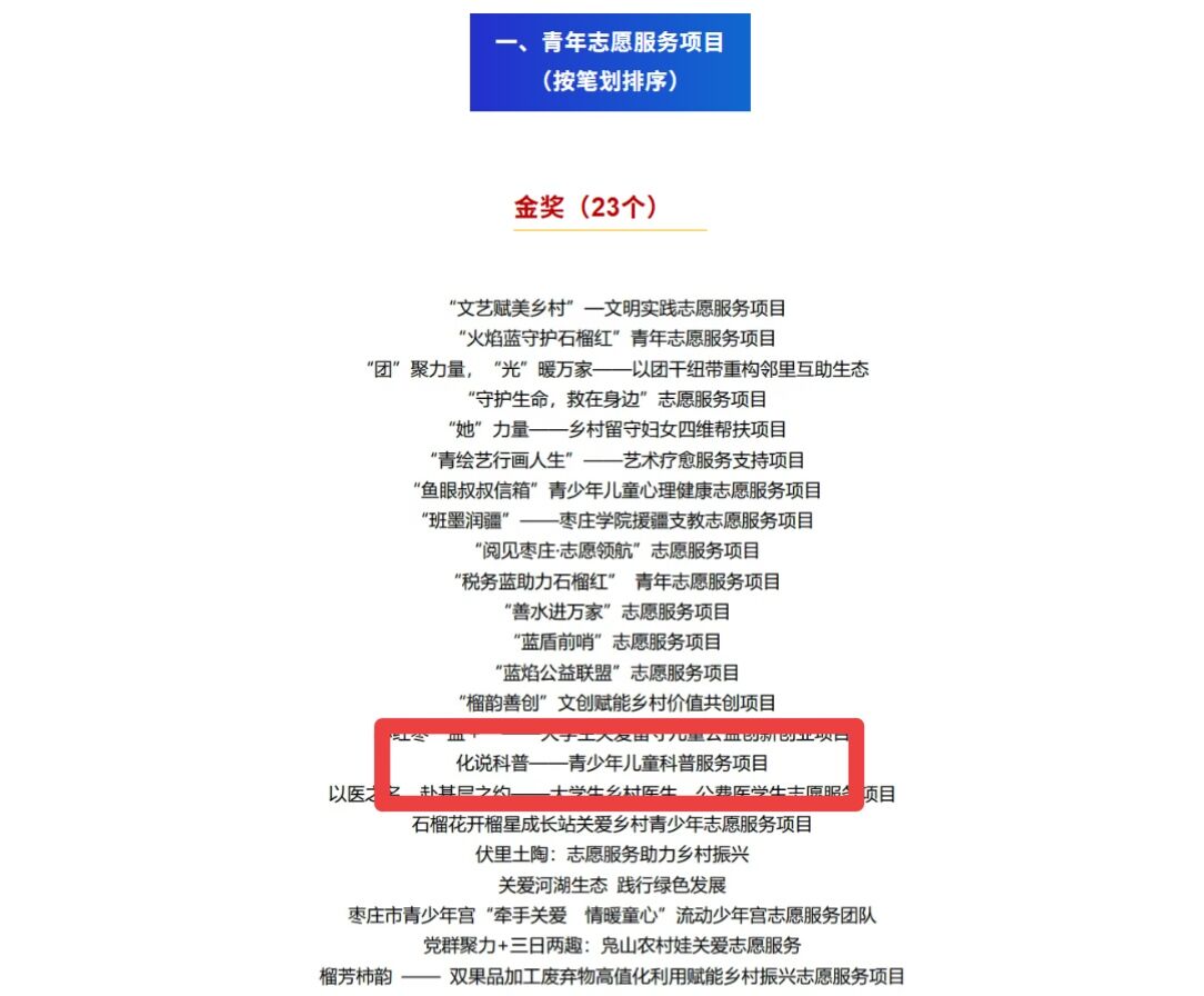 近日,第六届枣庄市青年志愿服务项目大赛圆满落幕,我院”化说科普——青少年儿童科普服务项目“凭借出色的志愿服务成效与专业特色,在大赛中斩获金奖。