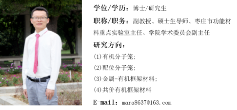 马杰,男,博士、副教授,曲阜师范大学兼职硕士生导师,枣庄市功能材料重点实验室主任、学院学术委员会副主任,yl7703永利集团青檀学者人才工程项目优秀青年人才。任教以来,主讲《分离工程》、《化工仪表及自动化》、《专业英语》、《无机化学A1/A2》、《无机化学实验A1/A2》等课程。目前,主要从事配位化学和超分子化学相关领域的研究工作,研究方向有:(1)有机分子笼;(2)配位分子笼;(3)金属-有机框架材料;(4)共价有机框架材料。迄今,主持完成国家自然科学基金青年基金项目1项,主持山东省自然科学基金青年基金项目1项。第一作者或通讯作者发表SCI论文10余篇,担任Crystal Growth & Design和Inorganic Chemistry Communications期刊审稿人。
